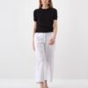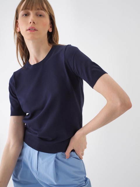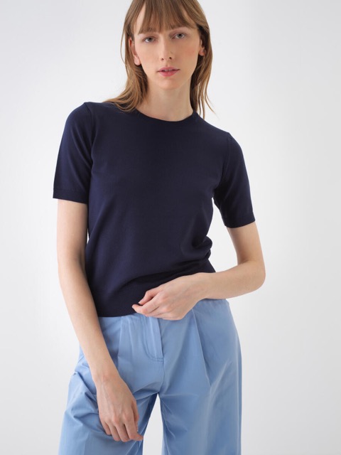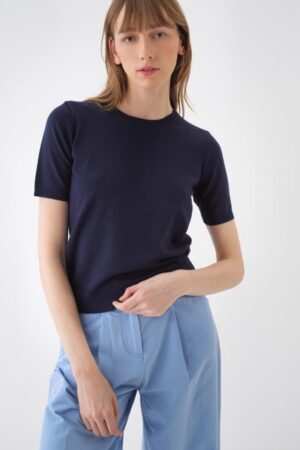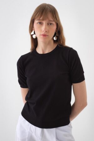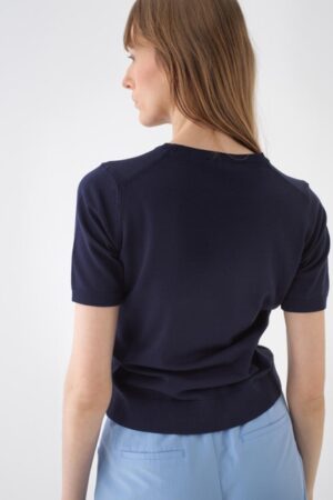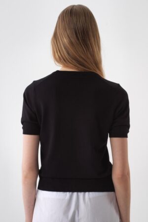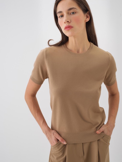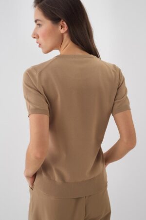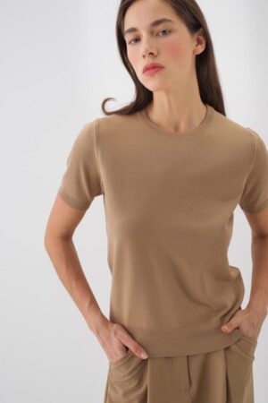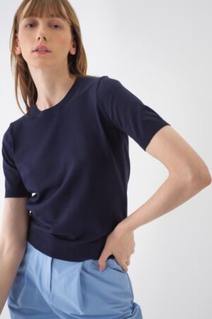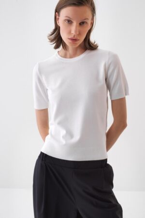 Short-sleeved round neck top crafted from a soft, fine-knit viscose blend. Finished with a ribbed hem and cuffs for a structured look.